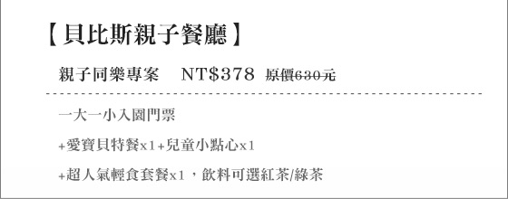 商品訊息簡述: 只要378元即可享有【貝比斯親子餐廳】原價630元親子同樂專案:一大一小入園門票+愛寶貝特餐x1+兒童小點心x1+超人氣輕食套餐x1,飲料可選紅茶/綠茶。