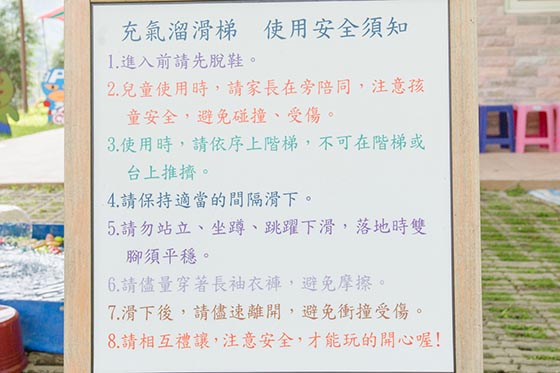 2. 園區內的大型溜滑梯因摩擦力較大,建議您穿著長袖長褲來玩,才不會磨傷您跟寶貝的皮膚。